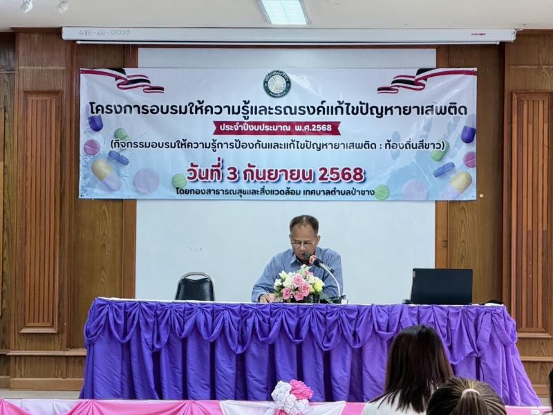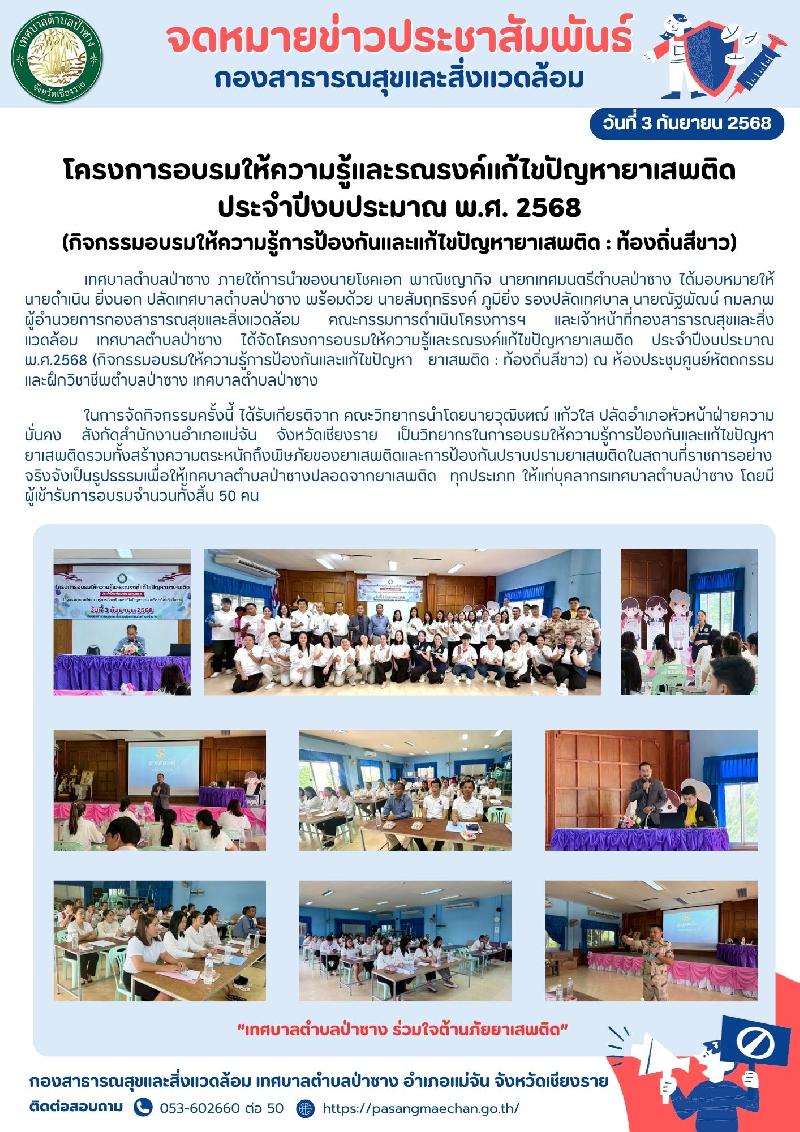 วันที่ 3 กันยายน 2568 กองสาธารณสุขและสิ่งแวดล้อมเทศบาลตำบลป่าซาง ได้จัดโครงการอบรมให้ความรู้และรณรงค์แก้ไขปัญหายาเสพติด ประจำปีงบประมาณ พ.ศ.2568 (กิจกรรมอบรมให้ความรู้การป้องกันและแก้ไขปัญหายาเสพติด : ท้องถิ่นสีขาว)    (ดู 22 ครั้ง)