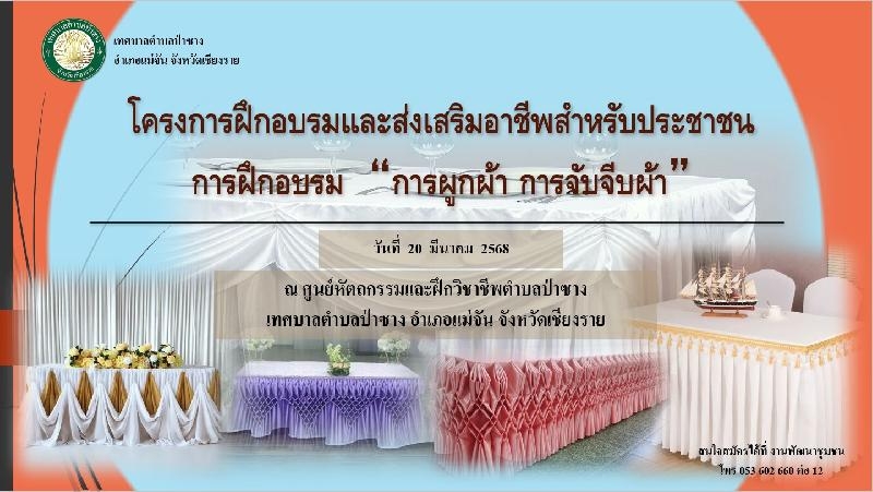 ด้วยงานพัฒนาชุมชน สำนักปลัด เทศบาลตำบลป่าซาง ได้จัดโครงการ การผูกผ้าและจับจีบผ้า จึงขอประชาสัมพันธ์เชิญชวนเข้าร่วมโครงการอบรมในวันที่ 20 มีนาคม 2568 สามารถสมัครเข้ารับการอบรมได้ตั้งแต่บัดนี้