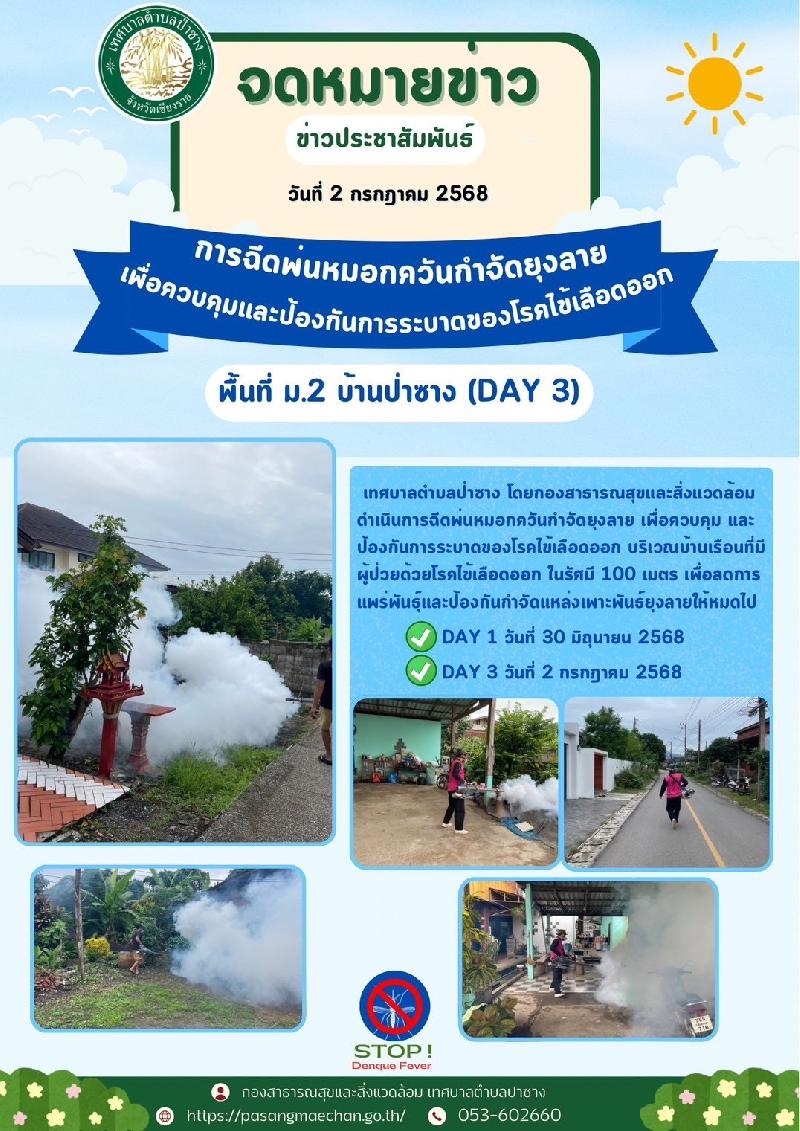 แผนการควบคุมโรค ✅ Day 1 วันที่ 30 มิถุนายน 2568 ✅ Day 3 วันที่ 2 กรกฎาคม 2568 Day 7 วันที่ 6 กรกฎาคม 2568การฉีดพ่นหมอกควันกำจัดยุงลายเพื่อความคุมและป้องกันการระบาดของโรคไข้เลือดออก พื้นที่ ม.2 บ้านป่าซาง กรณีพบผู้ป่วยด้วยโรคไข้เลือดออก