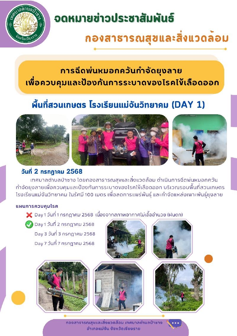 กองสาธารณสุขเทศบาลตำบลป่าซาง พ่นหมอกควันกำจัดยุงลาย เพื่อควบคุมและป้องกันการระบาดของโรคไข้เลือดออก พื้นที่สวนเกษตร โรงเรียนแม่จันวิทยาคม (Day 1)