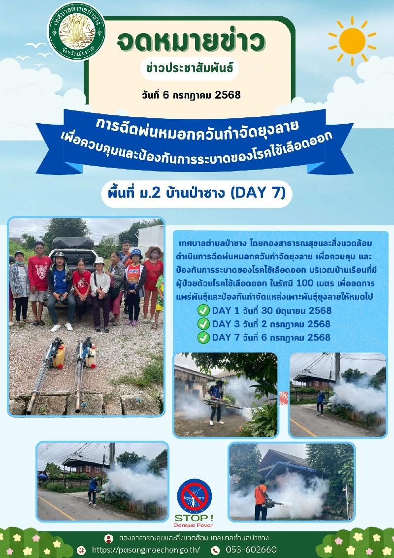 เทศบาลตำบลป่าซาง โดยกองสาธารณสุขและสิ่งแวดล้อม ดำเนินการฉีดพ่นหมอกควันกำจัดยุงลาย เพื่อควบคุม และป้องกันการระบาดของโรคไข้เลือดออก พื้นที่บ้านป่าซาง หมู่ 2 (DAY 7)