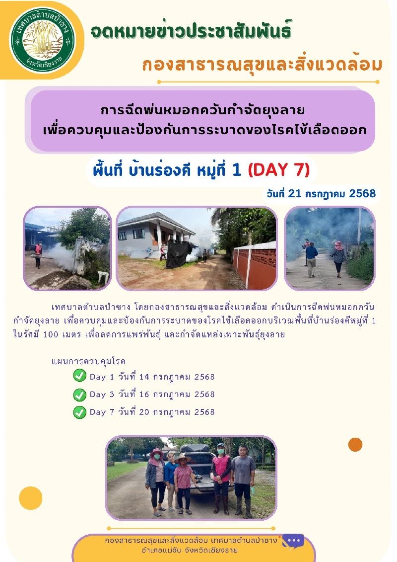เทศบาลตำบลป่าซาง โดยกองสาธารณสุขและสิ่งแวดล้อม ดำเนินการฉีดพ่นหมอกควันกำจัดยุงลาย เพื่อควบคุมและป้องกันเกิดโรคไข้เลือดออก บริเวณพื้นที่บ้านร่องคี หมู่ที่ 1 (DAY 7)