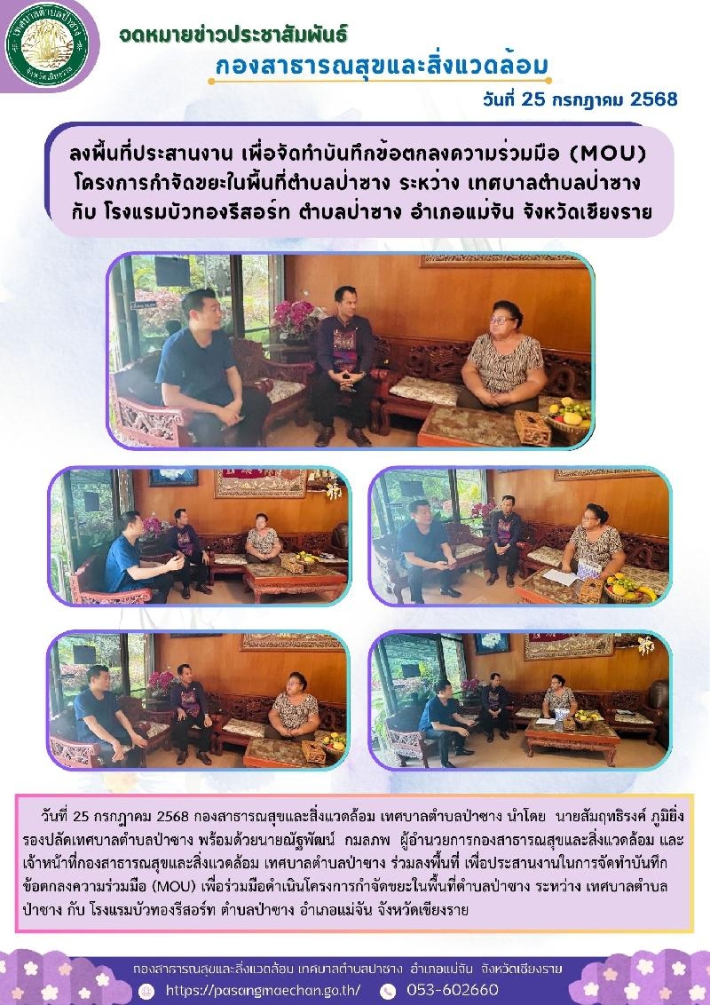 วันที่ 25 กรกฎาคม 2568 กองสาธารณสุขและสิ่งแวดล้อม เทศบาลตำบลป่าซาง ร่วมลงพื้นที่ เพื่อประสานงานข้อตกลงความร่วมมือ (MOU) ระหว่าง เทศบาลตำบลป่าซาง กับ โรงแรมบัวทองรีสอร์ท