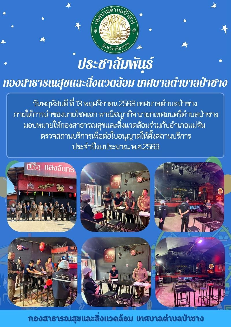 วันพฤหัสบดี ที่ 13 พฤศจิกายน 2568 กองสาธารณสุขและสิ่งแวดล้อมร่วมกับอำเภอแม่จัน ตรวจสถานบริการเพื่อต่อใบอนุญาตให้ตั้งสถานบริการ ประจำปีงบประมาณ พ.ศ.2569